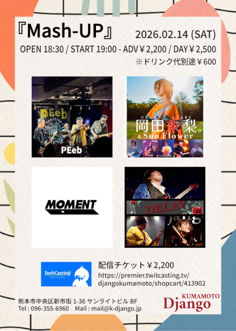 OPEN 18:30 / START 19:00 - ADV¥2,200 / DAY¥2,500 配信チケット¥2,200 ※ 入場時に別途ドリンクチケット代 ¥600をお支払頂きます。